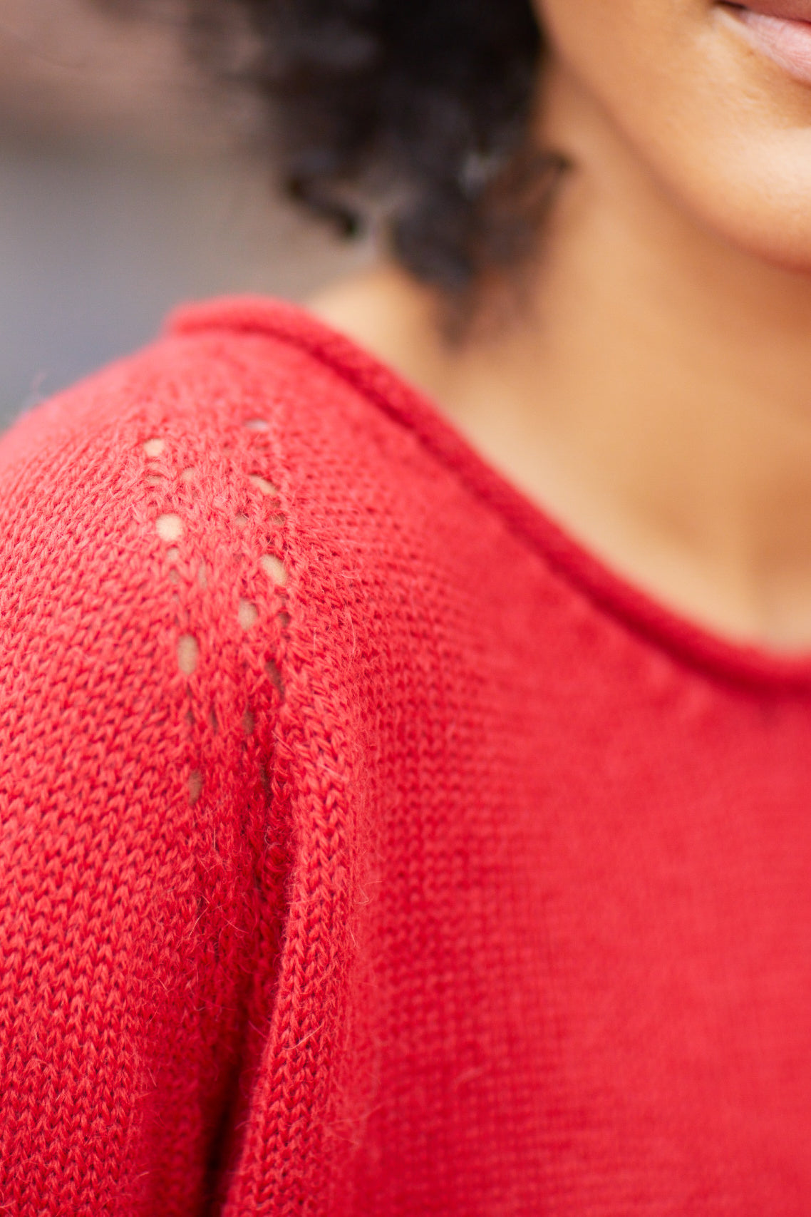 - Decorative eyelet seam at shoulder