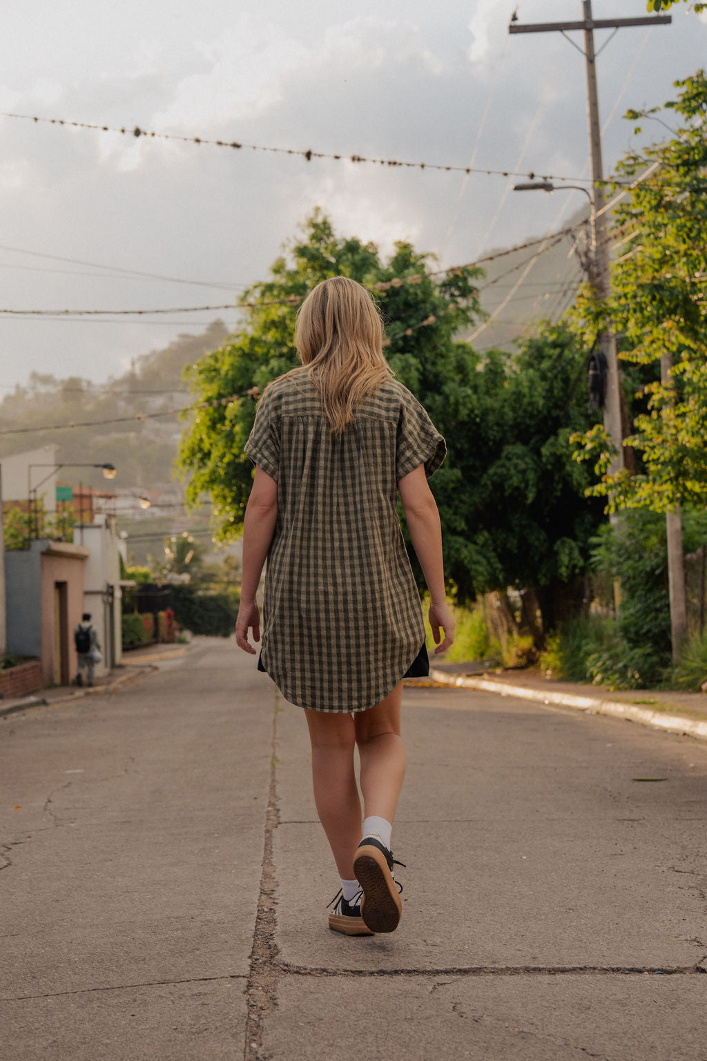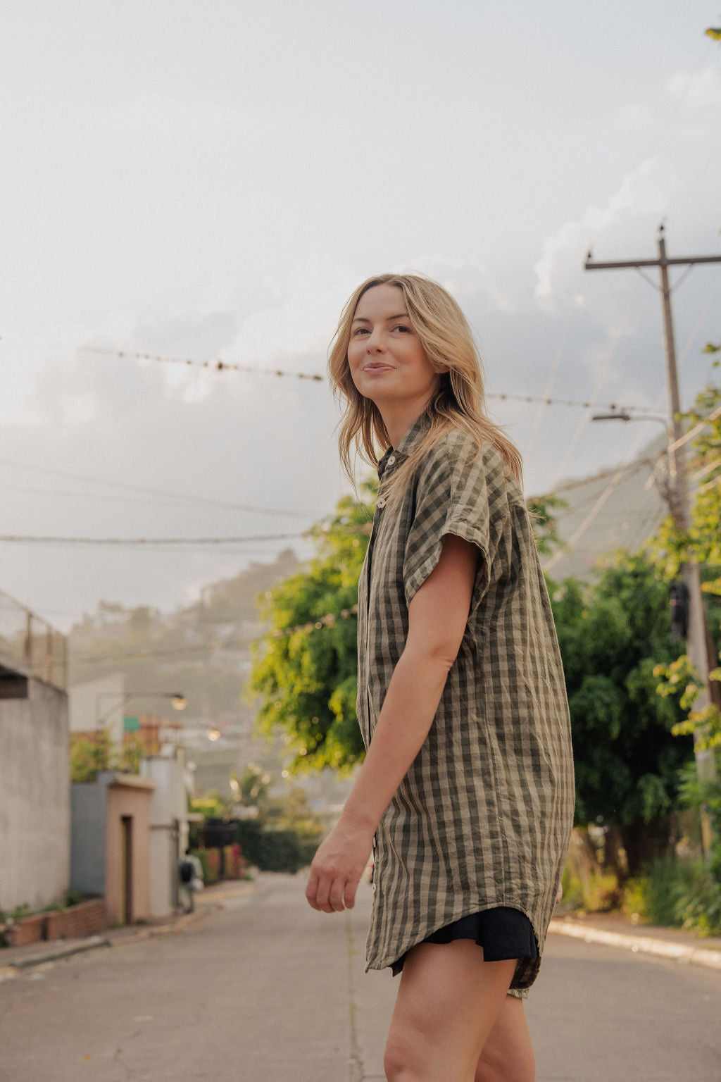 Paige Handwoven Cotton Relaxed Shirt Dress in Green Gingham - L, XL and XXL Left