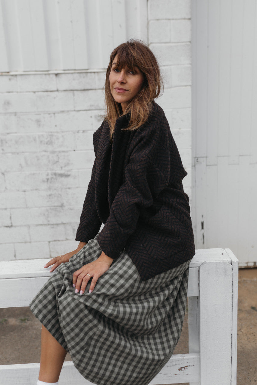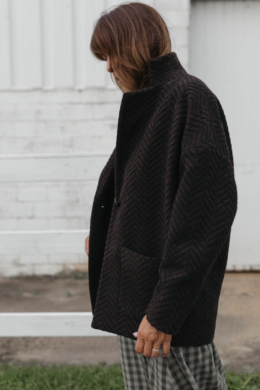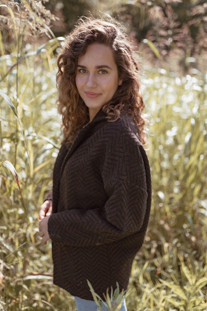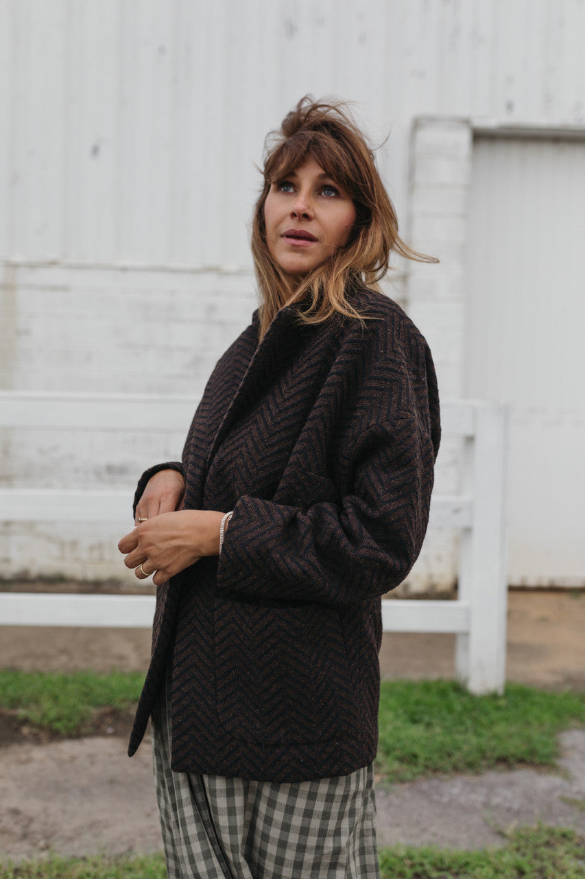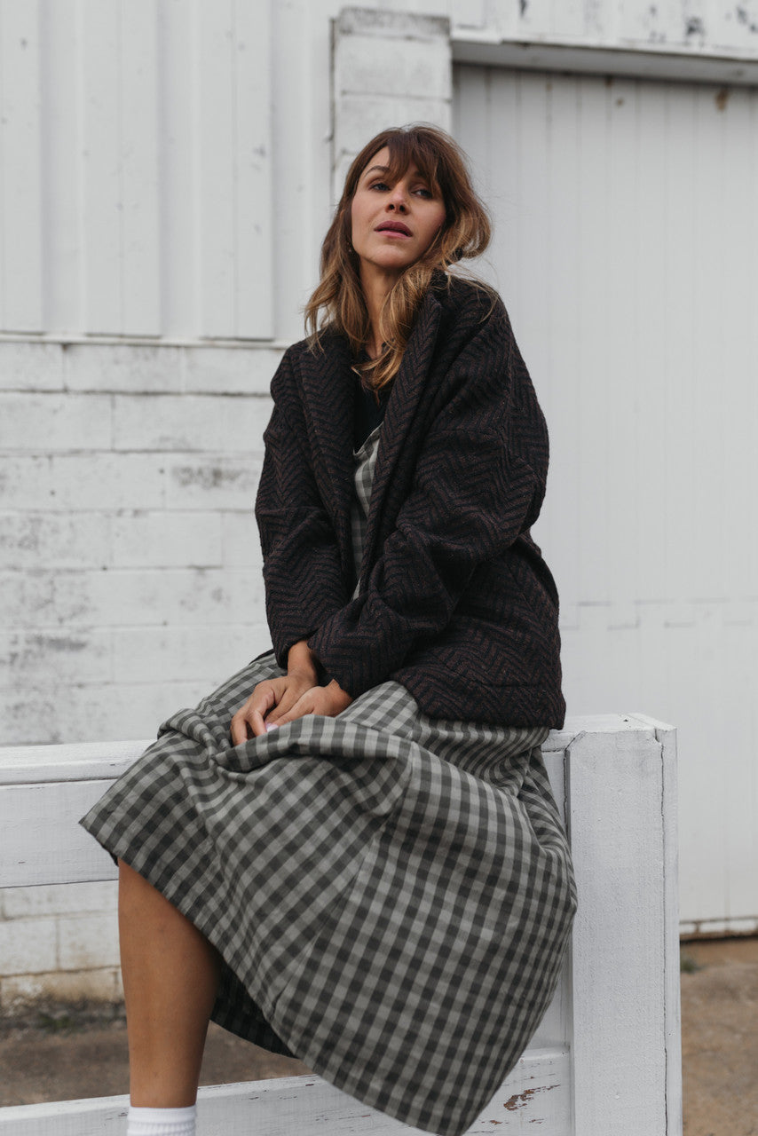 Portuguese Wool Pieper Coat in Black and Brown Herringbone Made to Order