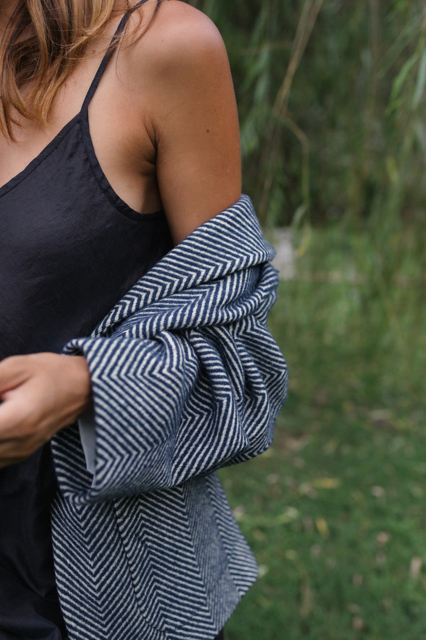 Portuguese Wool Pieper Coat in Navy and Cream Thin Herringbone Made to Order