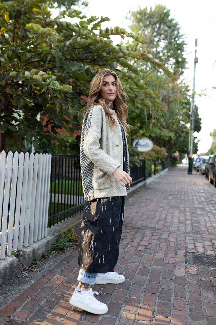 This jacket is intended to be oversized in the shoulders with a dropped sleeve and is most fitted at the hip. To find the best size, we recommend measuring the fullest part of your hip and choose the closest to that measurement below.