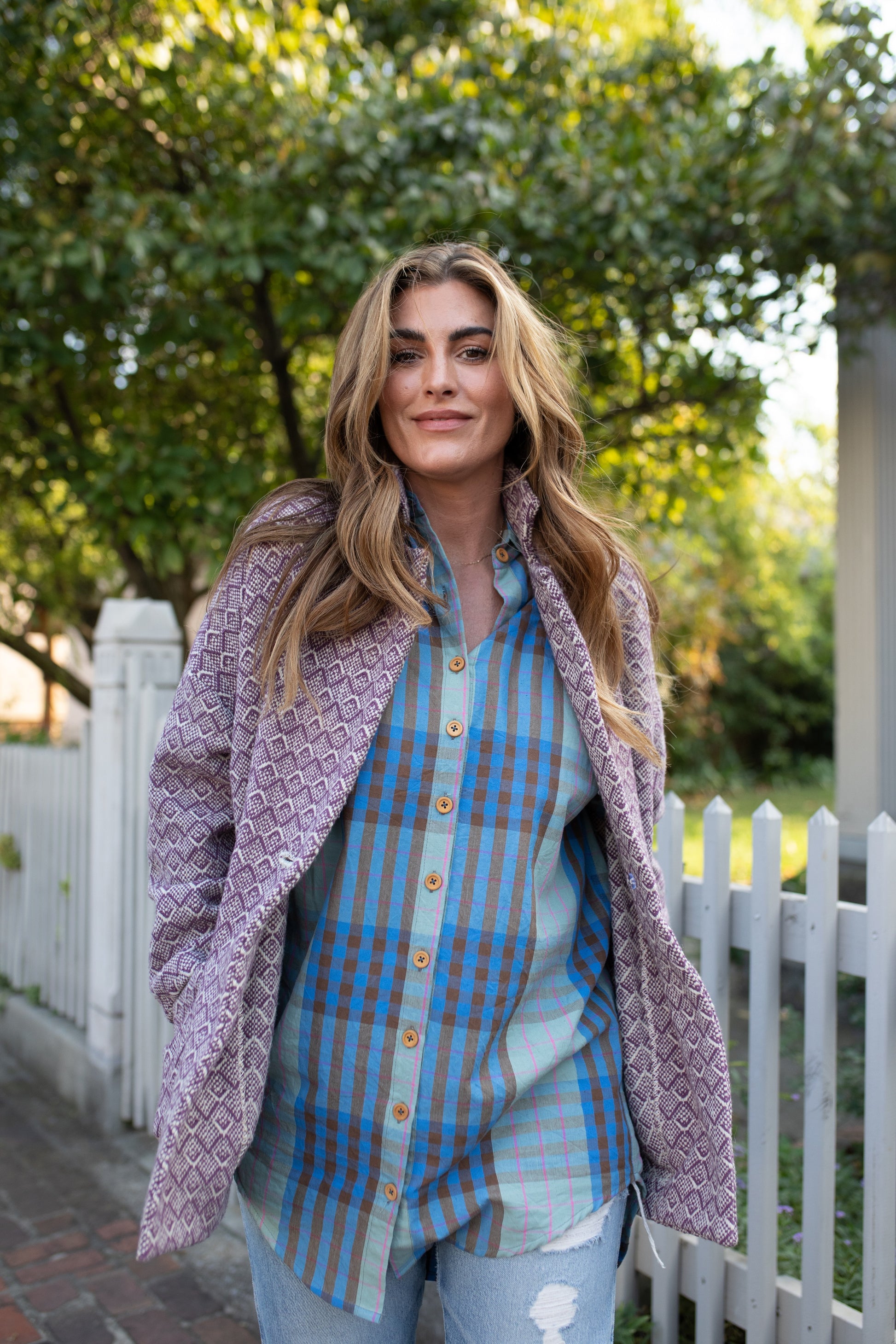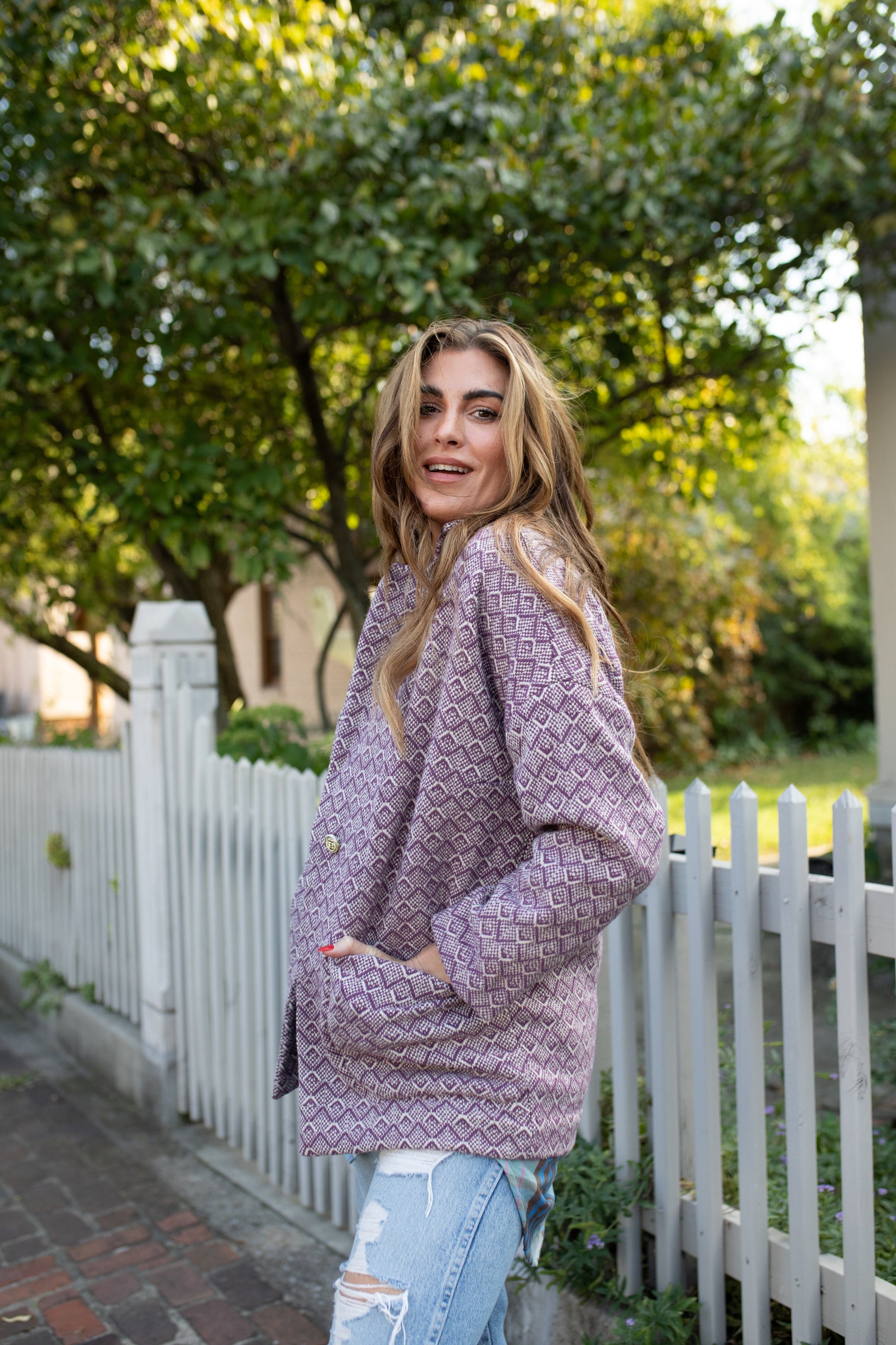 This jacket is oversized in the shoulders with a dropped sleeve and fitted in the hip. To find the best size measure the fullest part of your hip and compare with the measurements listed. You will want the hip measurement to be the same as your own or an inch or two over your size. If you would like more of an oversized fit as the mix-and-match images it is best to size up one size. If you would like more of a fitted look as the teal print images it is best to choose your true size. The rest of the images the models are wearing their typical size.