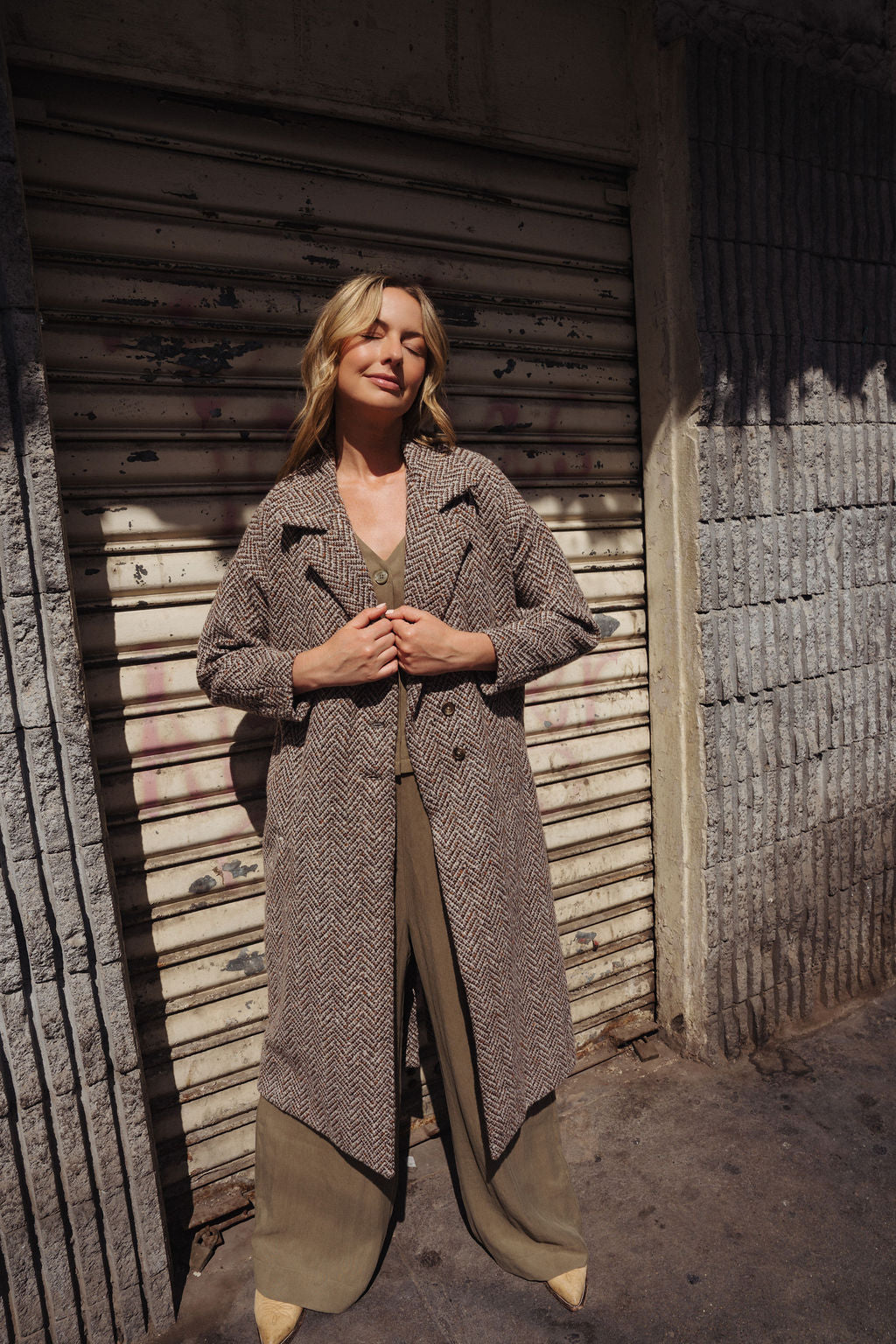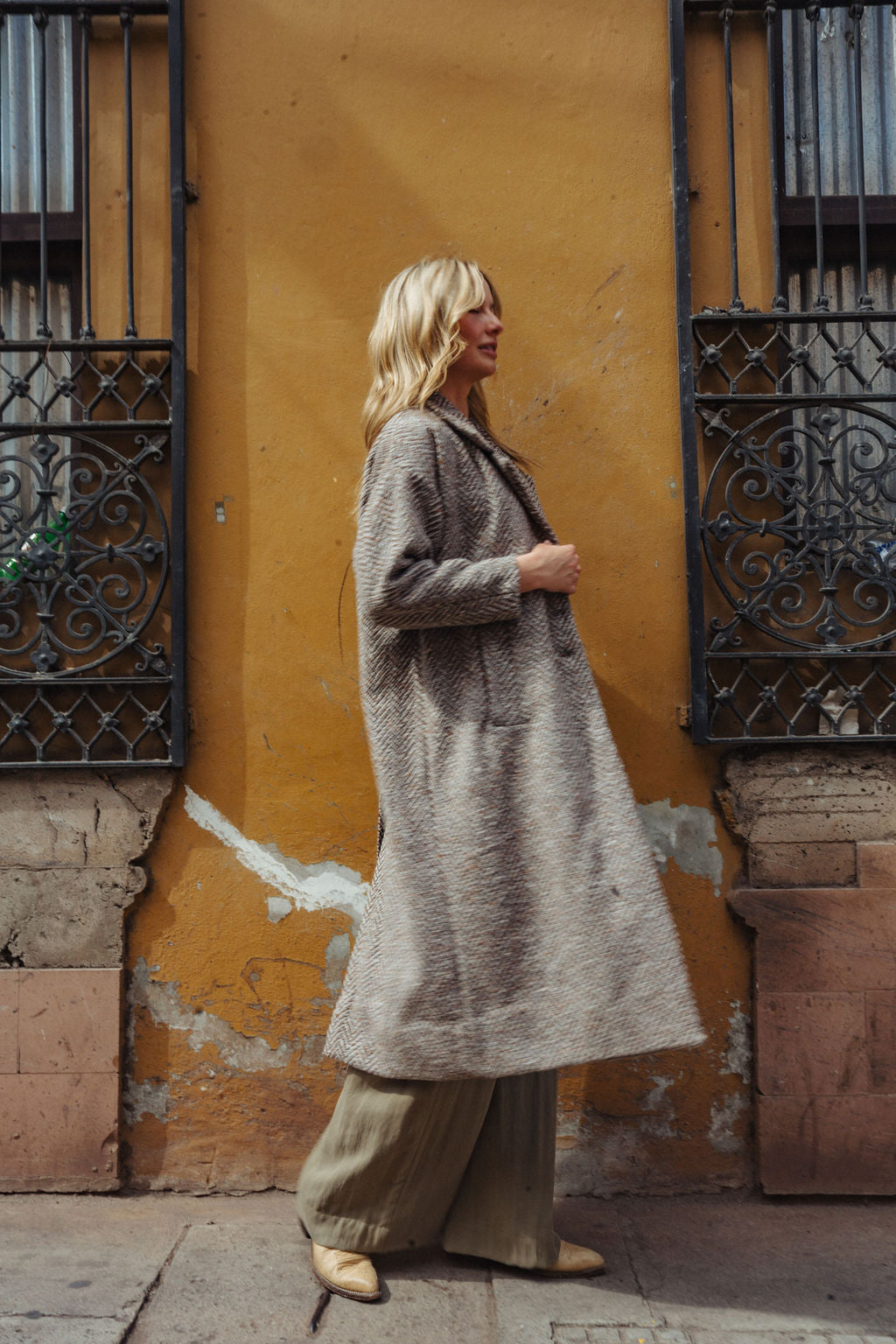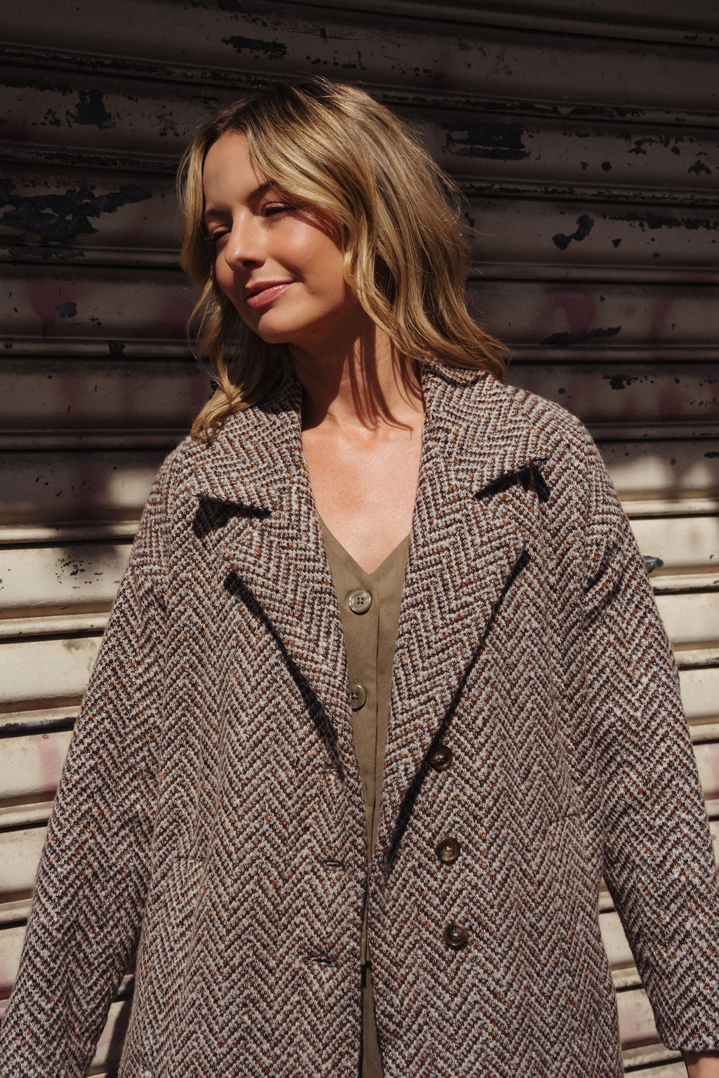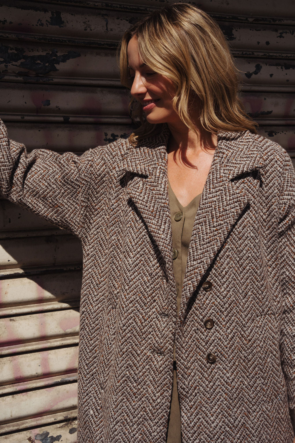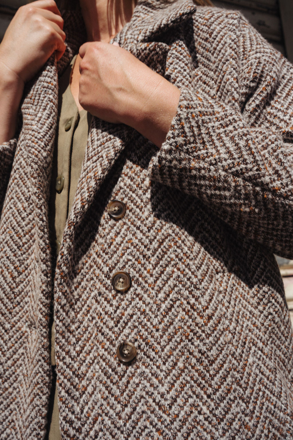 Portuguese Wool Polly Coat in Heathered Brown and Cream Herringbone Made to Order