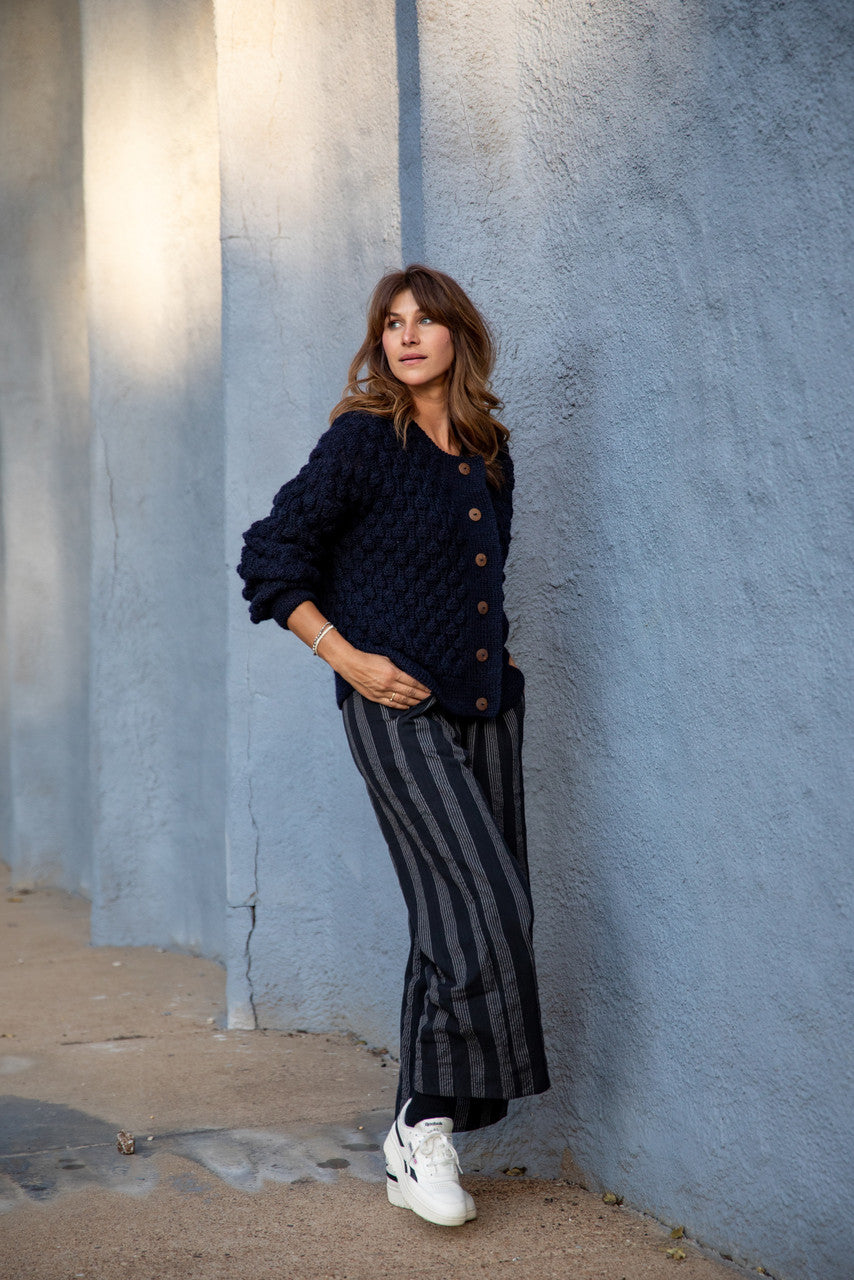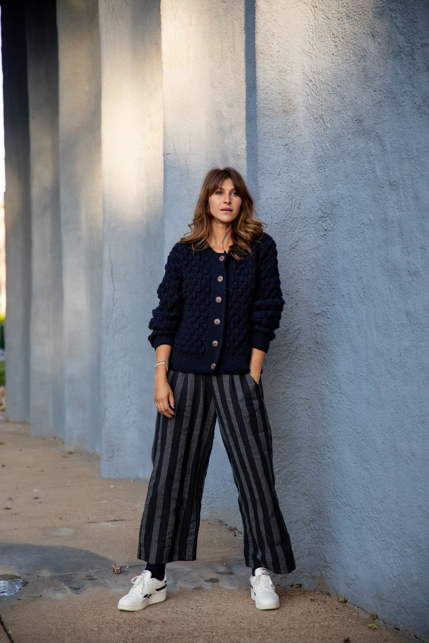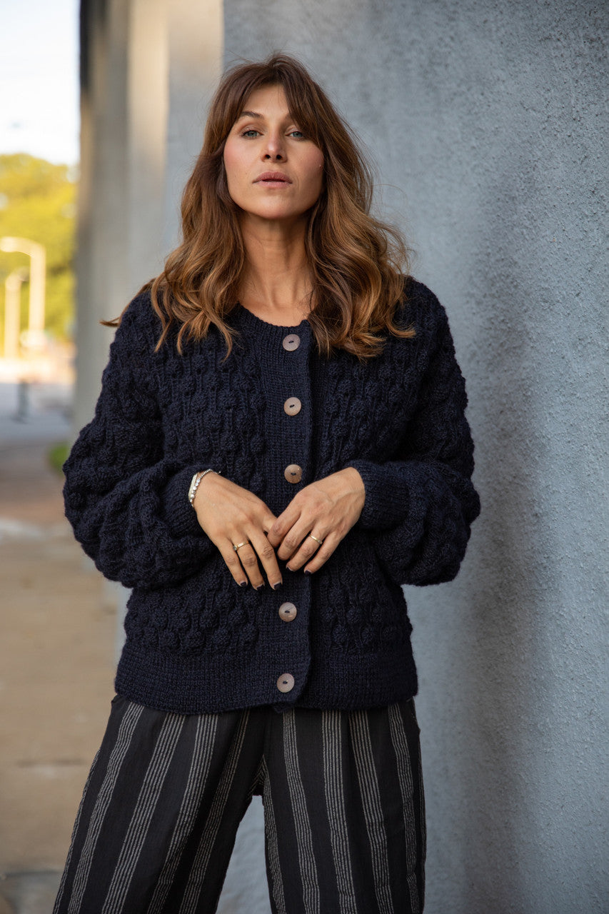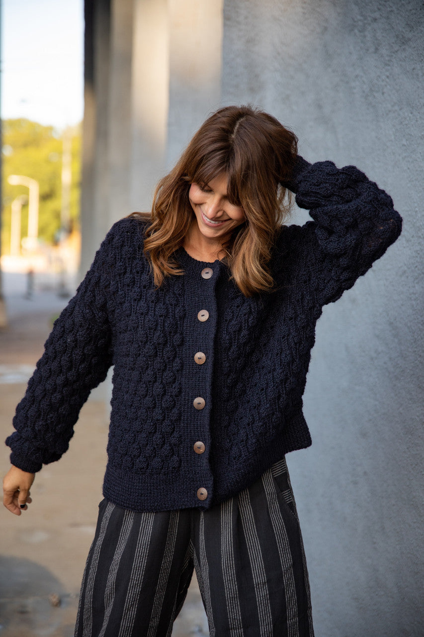 Vintage inspired cardigan with a textured knit and wide border trim. Super warm!