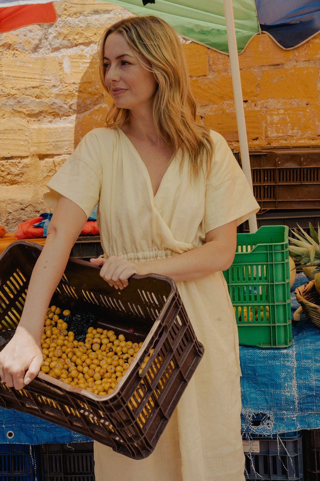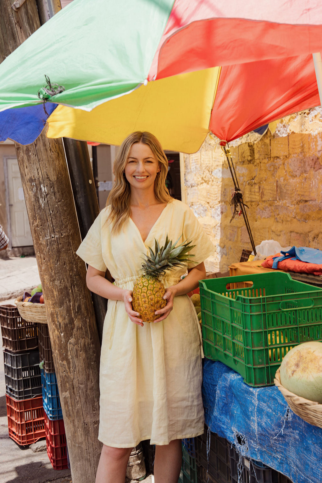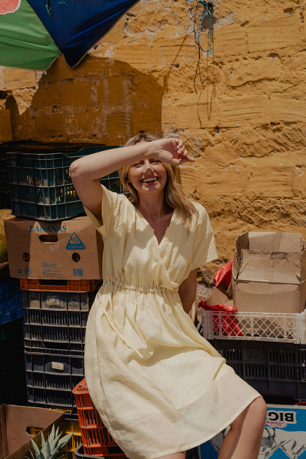 Rose Drawstring Dress in Pale Yellow Linen